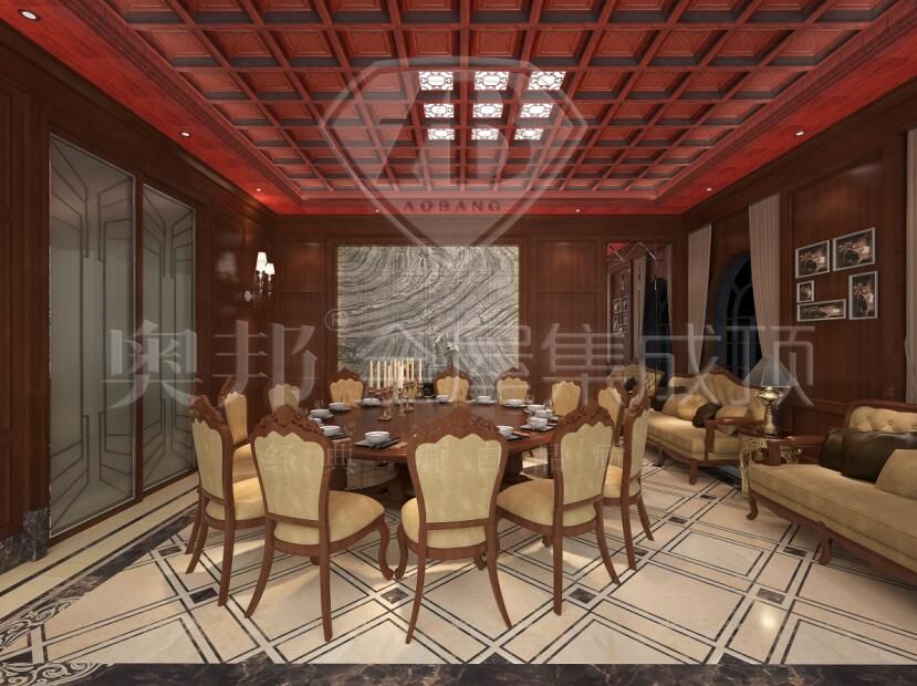 酒紅色的餐廳極具年代的厚重感,配以白色的燈,多了及分雅致清新,看起來簡約大方,頗暗色調的地面看起來簡潔素雅。復古的家居使整個空間多了幾分古典韻味,背景墻面更是給空間添了幾絲禪韻。